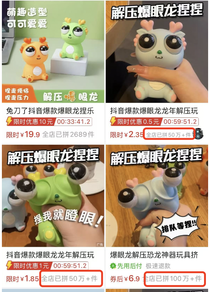 记者从义乌商家处了解到,这款“爆眼龙”捏捏玩具本来是一个已经过时生肖产品,除了龙还有其他款式。在没火之前根本没什么人买,价格还不到一块钱。但是在“刀乐哥”的影响下,“爆眼龙”马上要断货了,很多厂家都在准备重新生产这个产品。