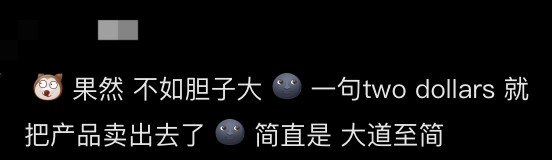 推销过程中,无论外国人说什么,该博主都只会回复“吐刀乐(Two dollar)”等几个简单的英语单词。这也让不少网友吐槽其英语“太塑料”。有网友戏称:“别人出国是雅思托福,刀乐哥背了五个单词就敢勇闯美国。”