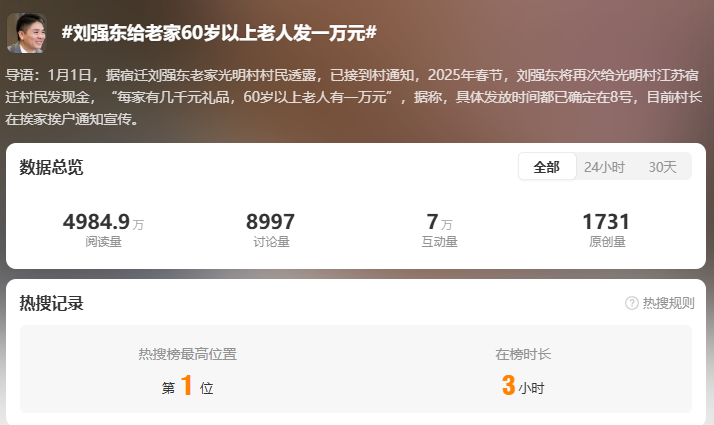 1月2日,#刘强东给老家60岁以上老人发一万元#话题登上微博热搜第一。